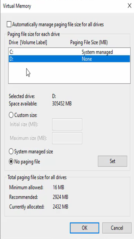 هنا في الخانة الاولي وهي Initial size سأكتب الحد الأقصى هذا الرقم لأن لدي 16 جيجابايت من ذاكرة الوصول العشوائي ثم سأكتب 24576.